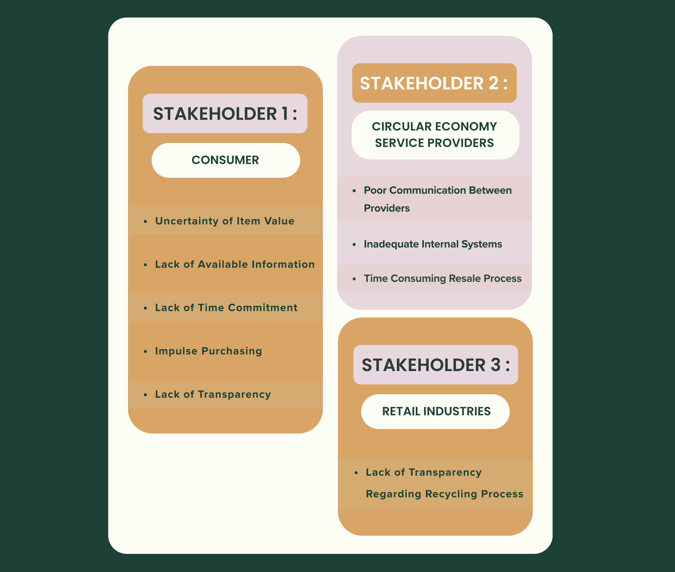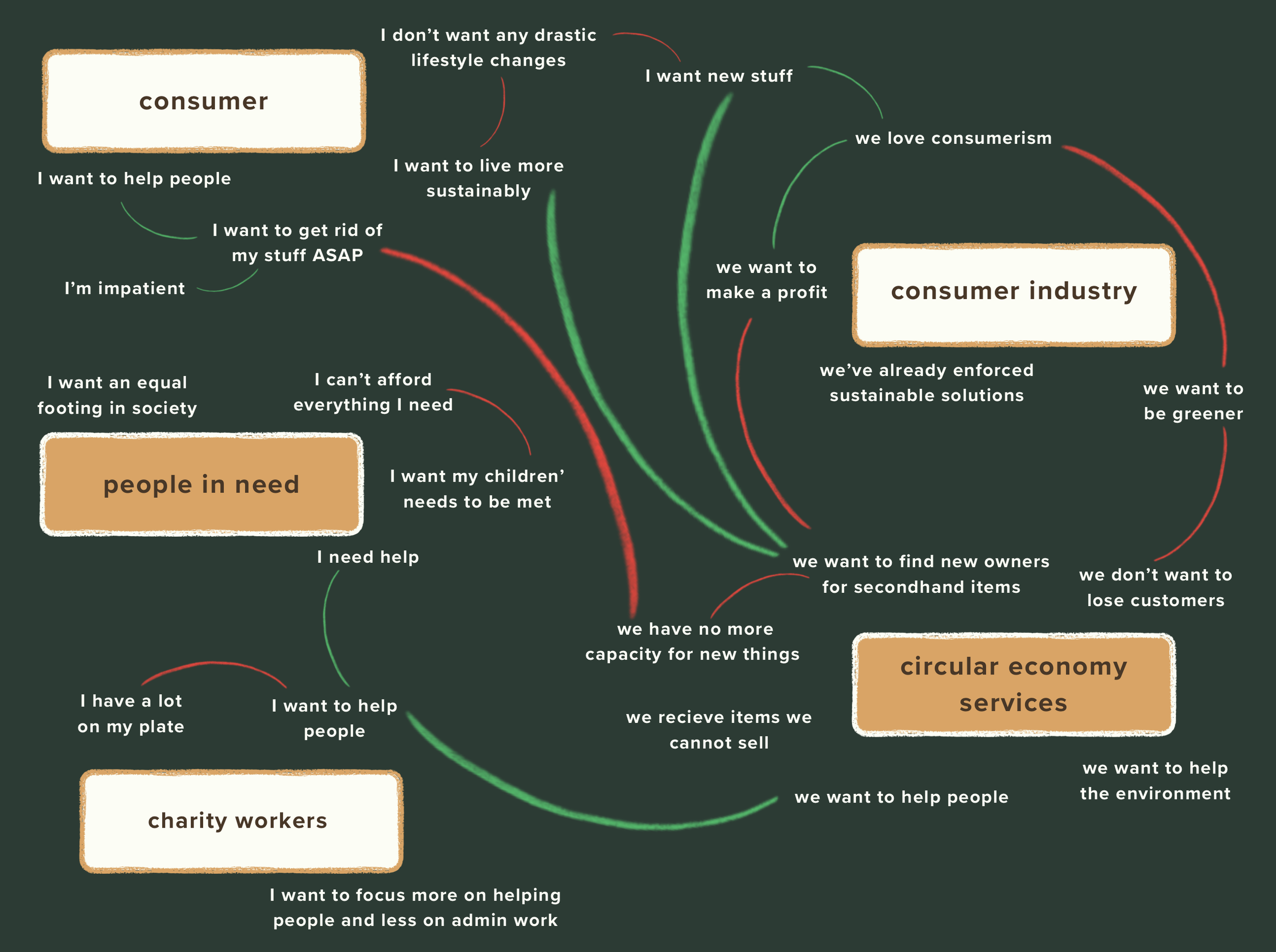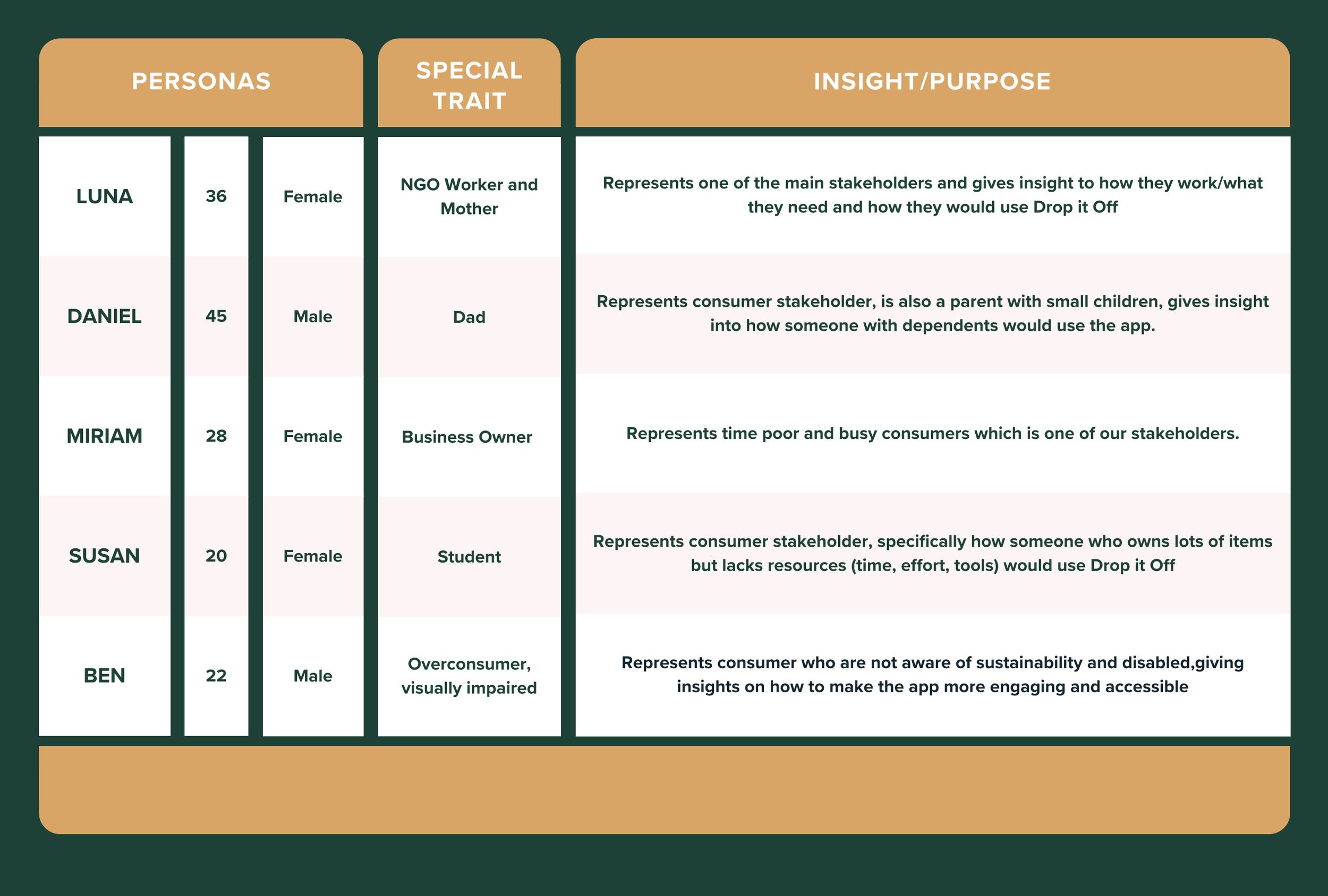 These personas included an NGO worker, a time poor business owner, an environmentally conscious consumer, a student lacking resources, and an overconsumer who did not care about the environment.