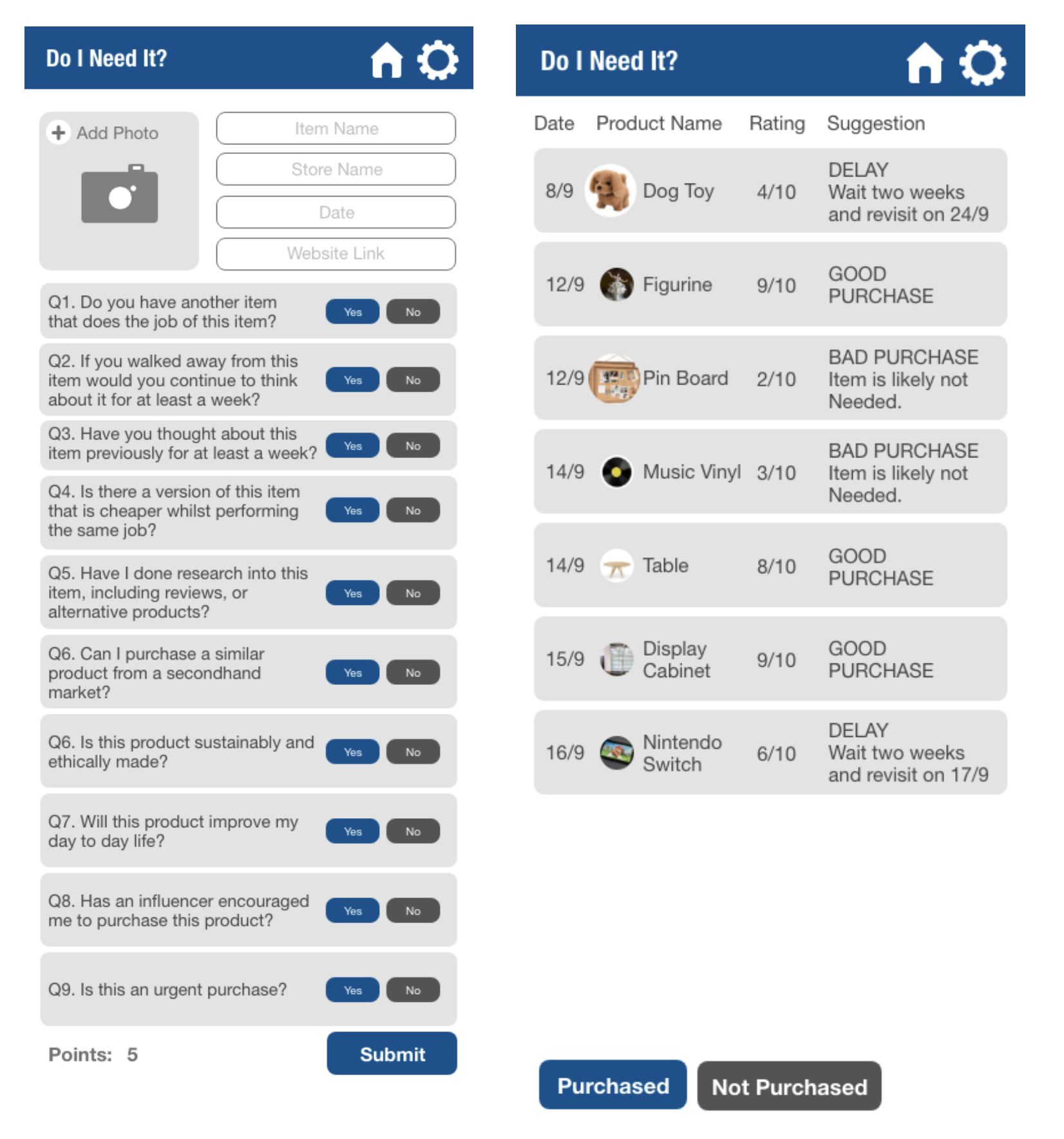 2. Do I Need It: A service designed to help consumers stop impulse purchasing by allowing them to ruminate over their wants to determine if they truly need the item, thus reducing overconsumption.